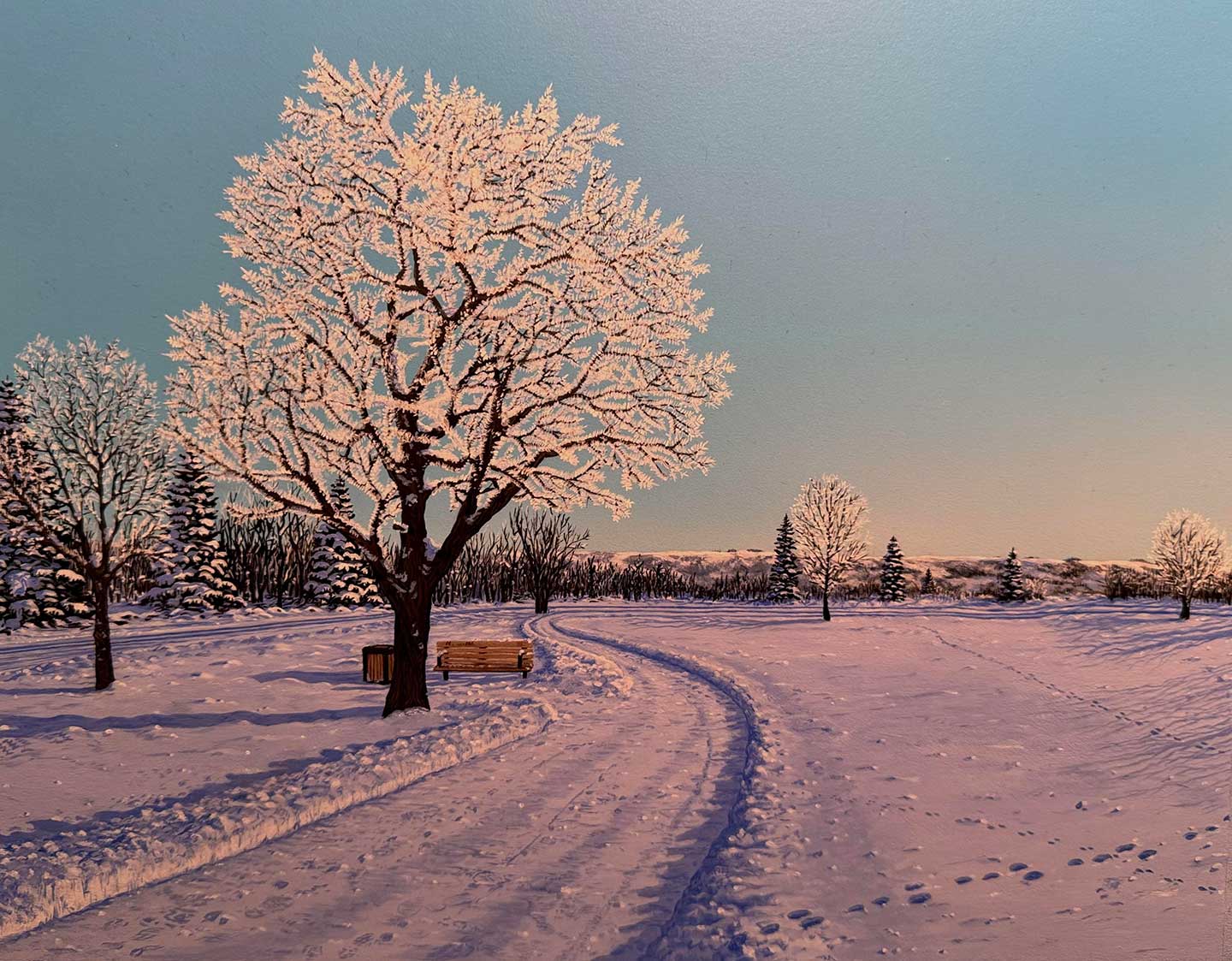 This piece captures the spirit of the valley and trails, showing how striking they can be in any season or temperature. There will be items hidden in the landscape of this work and when the image is complete Glen will give us a list of items.