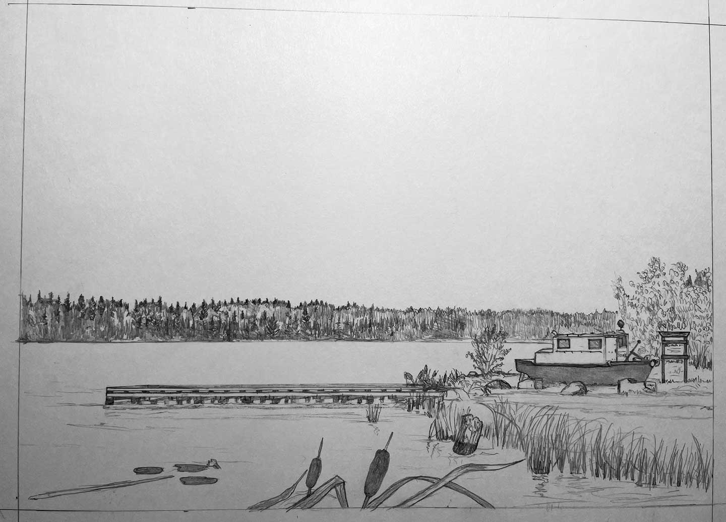 In this new piece, the northern lights will be blazing in the sky with their reflection glimmering in the lake. Fall colours are seen on the shores of the lake and Glen plans to hide many items in this work that have helped shape Big River over the years the the town it is today. A few items that will be hidden are; Sawmill, logging, fishing (commercial/tourist), Hockey, gateway to the north and so on.